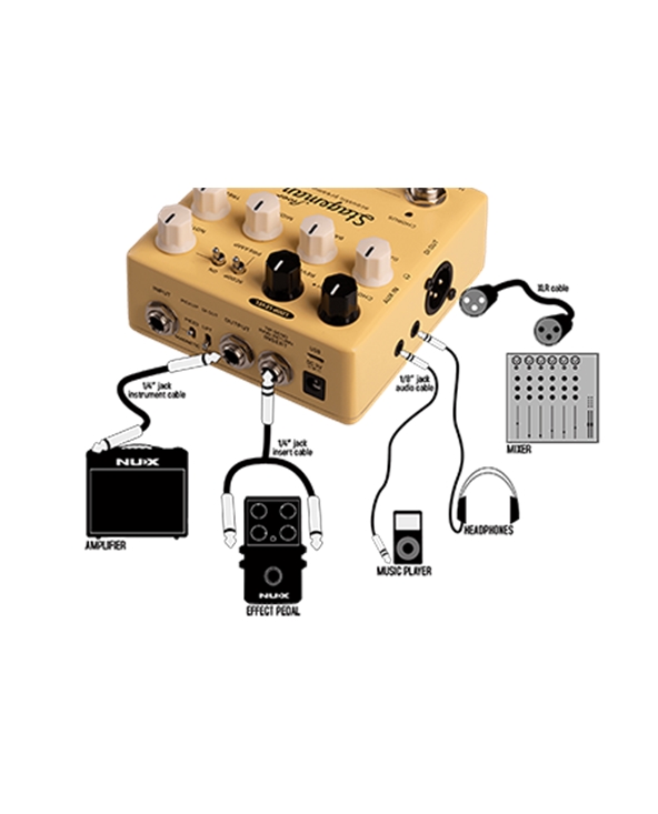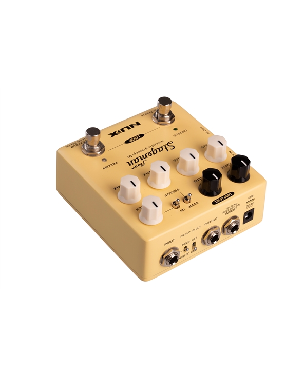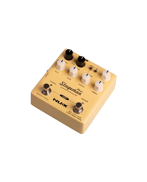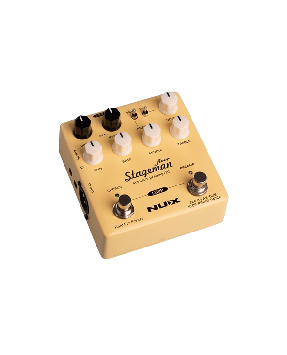 NUX Stageman Floor is an analog acoustic preamp with digital effects and looper function. It’s a preamp, featuring a highly sensitive 3-band EQ with MID scoop toggle switch, an adjustable notch filter, and input gain control, provides ginormous headroom and delivers the sound all natural.