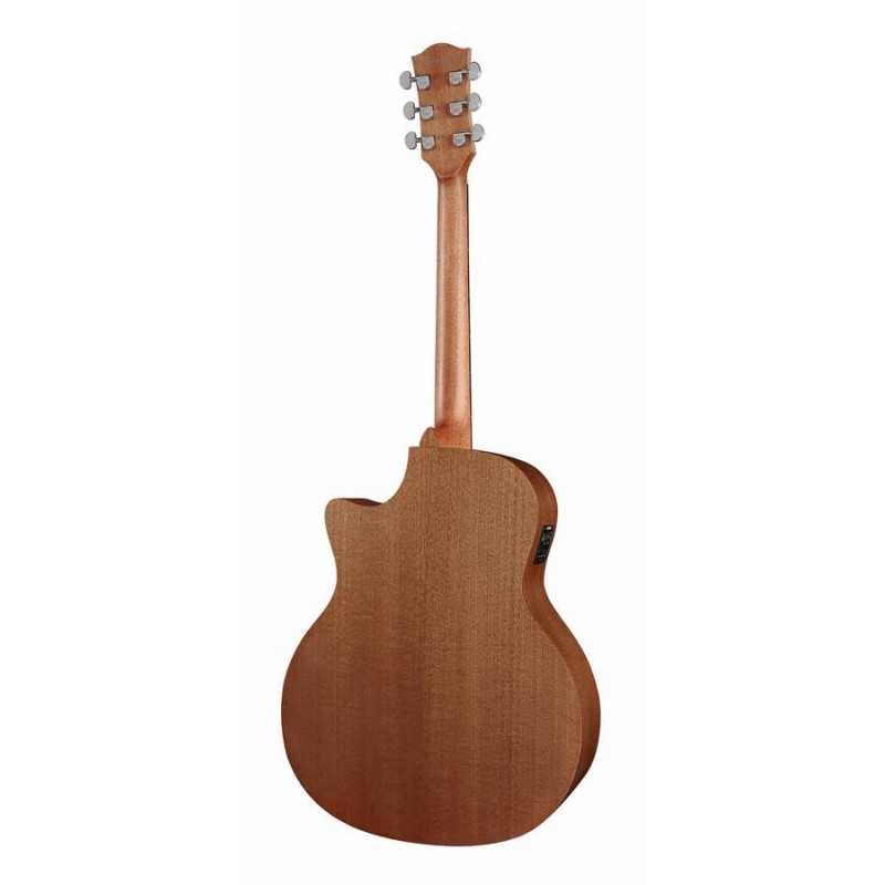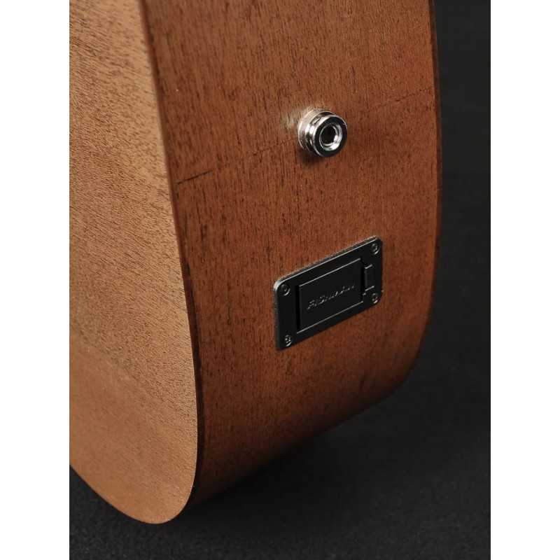 The solid mahogany top and the mahogany sides and back sound warm with an emphasized midrange. A sound many people love.