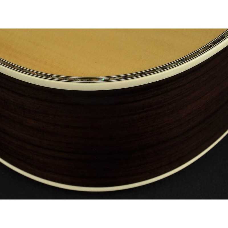Our D-70-VA model is a the top instrument of the Master Series. It features an AA solid sitka spruce top, Indian rosewood sides and back, ebony fingerboard and bridge and extensive real abalone inlays. Due to the wood choice, these instruments respond and project exceptionally well. Again an instrument that will positively amaze you when you pick it up. The dreadnought is commonly seen as a strumming instrument. The loud tone and the bold and sonorous low end really shine when played with a pick. The big body gives the D-70 a full sound with lots of detail and lots of dynamics.