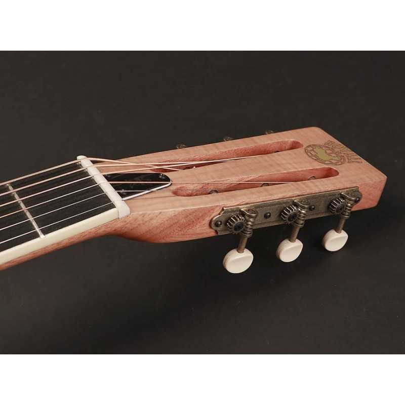 The Bantam Blazer is a maple body resonator guitar in parlor size. The beautiful flamed maple body and the 14th fret body connection are just begging to be played onstage. The neck is 46 mm wide at the nut enabling all playing styles. For onstage use we recommend installing the USA- RESO magnetic pickup for trouble-free amplification.