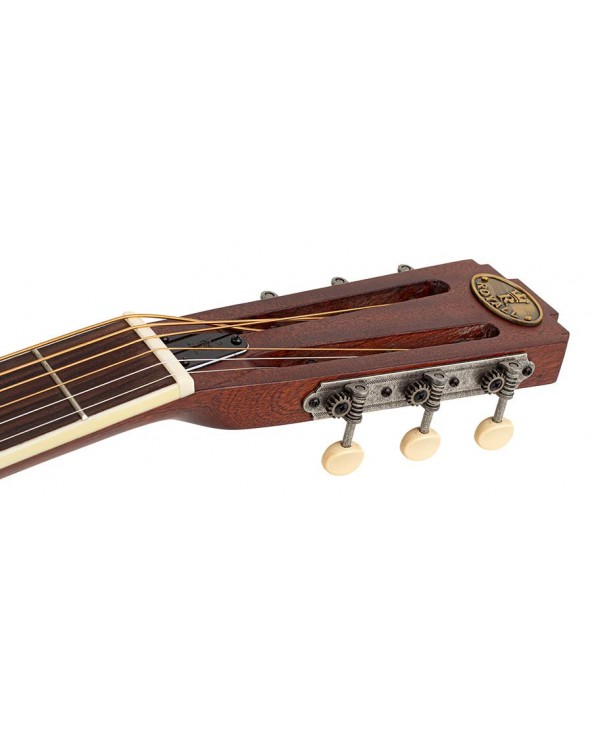 The 14 fret neck joint will allow you to play in the higher positions with ease. The mahogany neck with the 46 mm wide nut is comfortable to play and the set-up is done in the Royall workshop to have great playability with fingers and bottle neck alike.