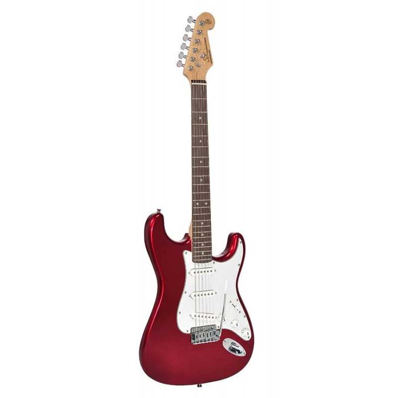 electric guitar, with 3 single coil pickups and vintage tremolo, bag, candy apple red