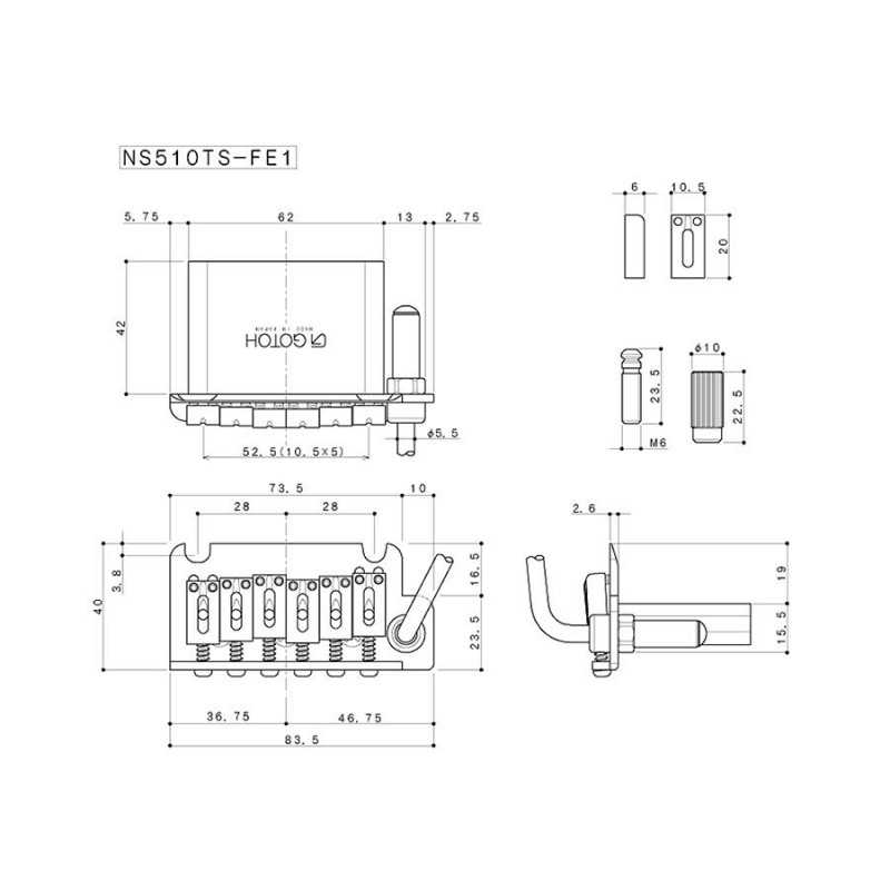 This high quality Gotoh tremolo is equipped with solid steel saddles and features a narrow string spacing (10.5mm saddle width). Both the baseplate and the tremolo block are made from hardened steel to improve tone. The steel block/steel baseplate is revered by tone hounds as the must-have for tremolos. It features two pivot points. All screws, claw, allen keys and the tremolo arm are included.
