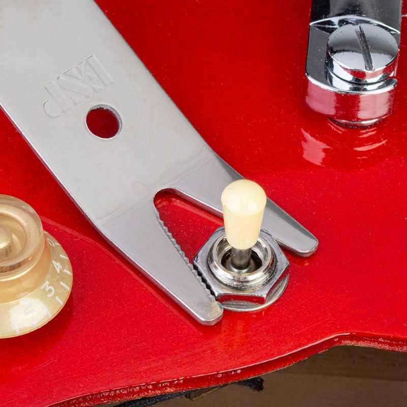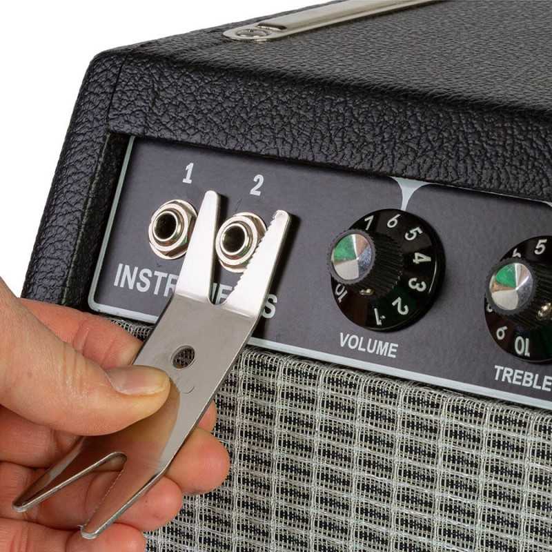 Store this versatile little steel wrench in your guitar case and you can quickly fix a loose output jack, control pot, pickup switch or tuning machine. Turn adjustable bridge thumbwheels more easily, too. One end of the multi spanner is toothed for loosening a nut: the other end tightens it. A mere .075" (1.90mm) thin, the tool can fit under a control knob and is specially angled for clearance over a guitar body or peghead.