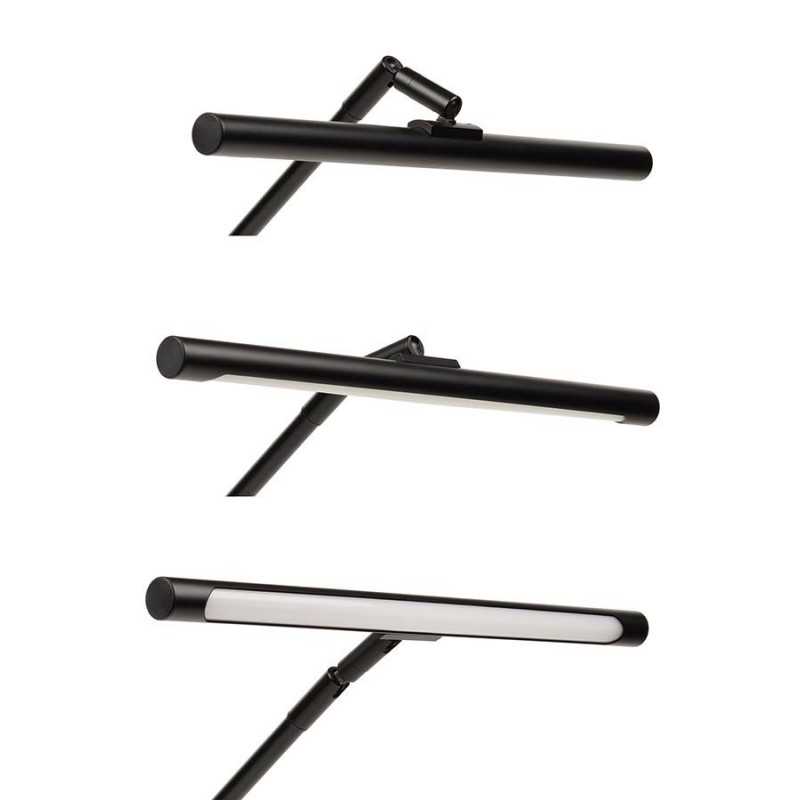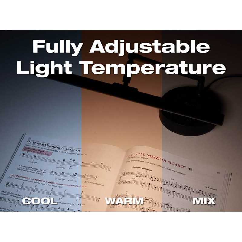 Black satin aluminium piano lamp with 78 bright LED lights. This lamp has a dimmable color temperature from 3000K till 6500K. The adjustable tube offers flexible positioning in different angles and is therefore ideal on an acoustic and digital piano as well as on a classical organ. The round weighted base has a diameter of 13 cm. In the base you will find a wireless 10W charger and a USB charger port. The lamp comes with EU adapter.